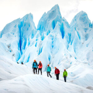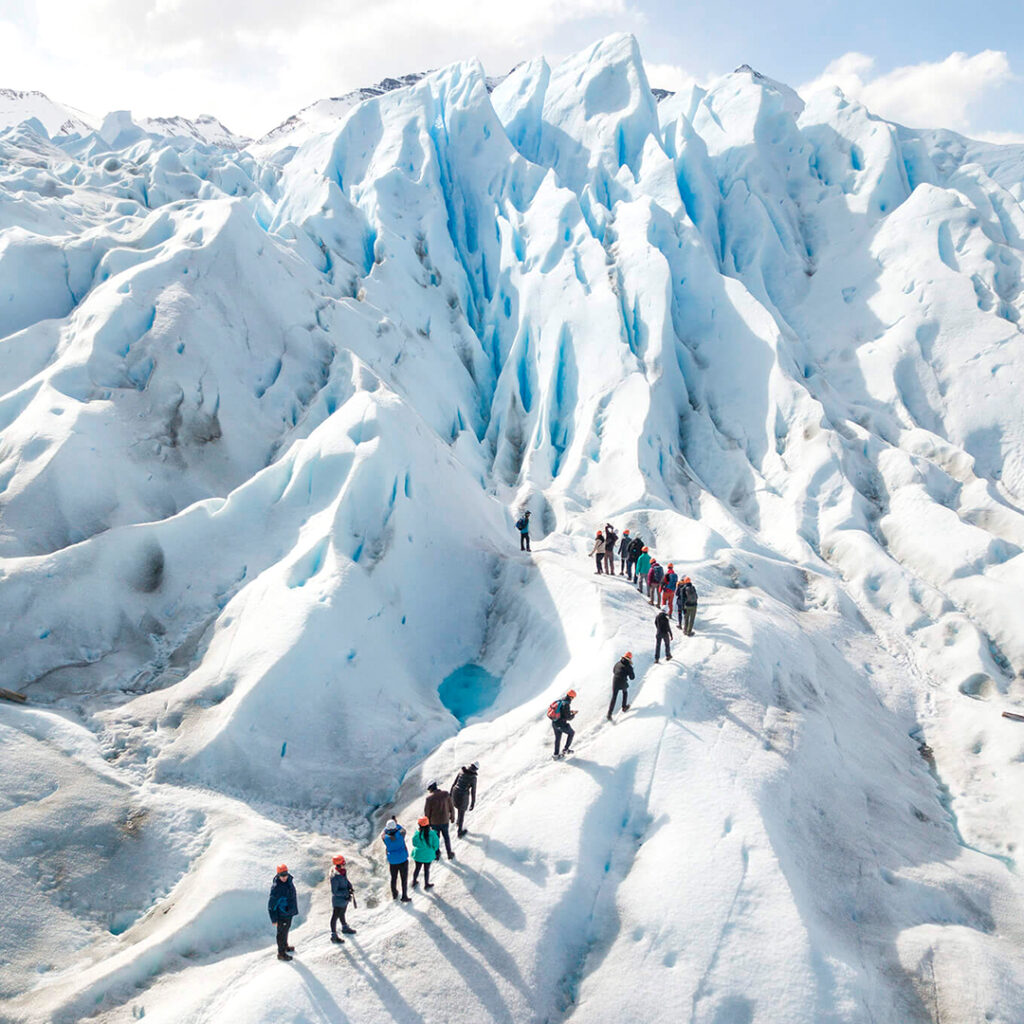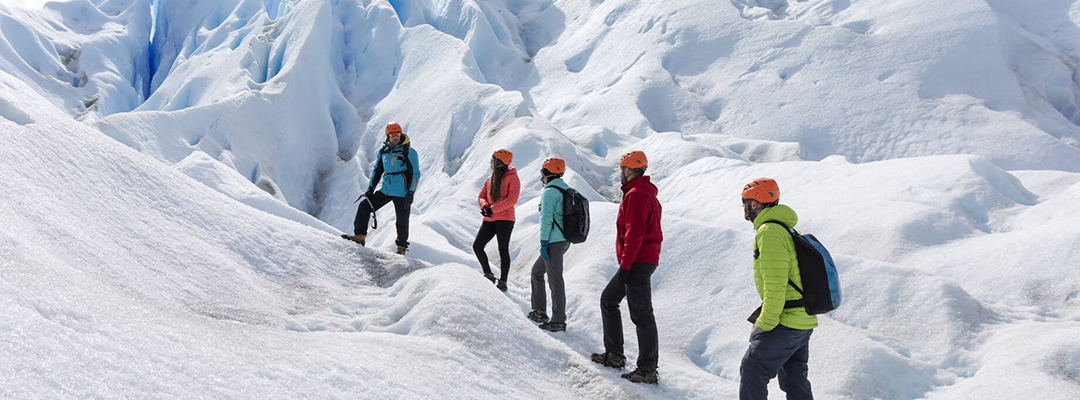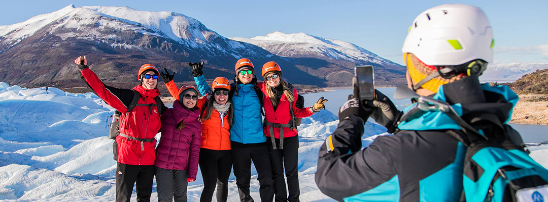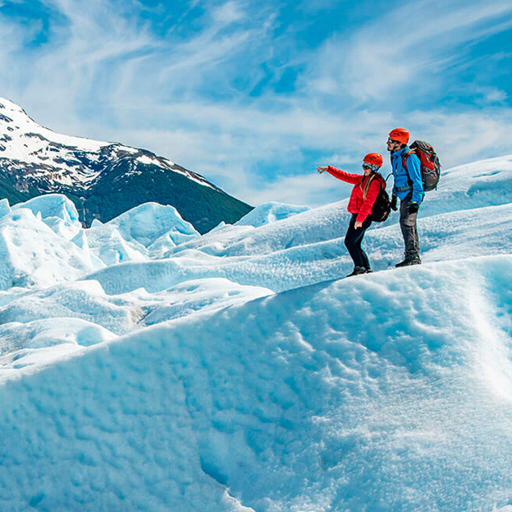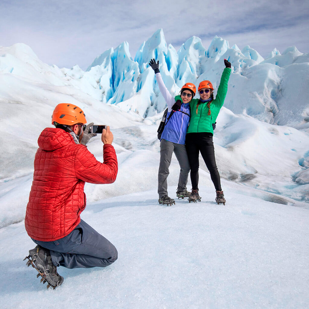 Al llegar al borde del glaciar, con las sorprendentes tonalidades azules del hielo enmarcando el paisaje, se organizarán subgrupos de un máximo de 20 personas cada uno y se les colocarán los crampones y cascos provistos por la empresa. Esta excursión es altamente personalizada (un guía cada 10 pasajeros máximo). Una vez sobre el glaciar, recibirán una charla de seguridad y caminarán para disfrutar de este paraíso helado declarado Patrimonio de la Humanidad (1981).